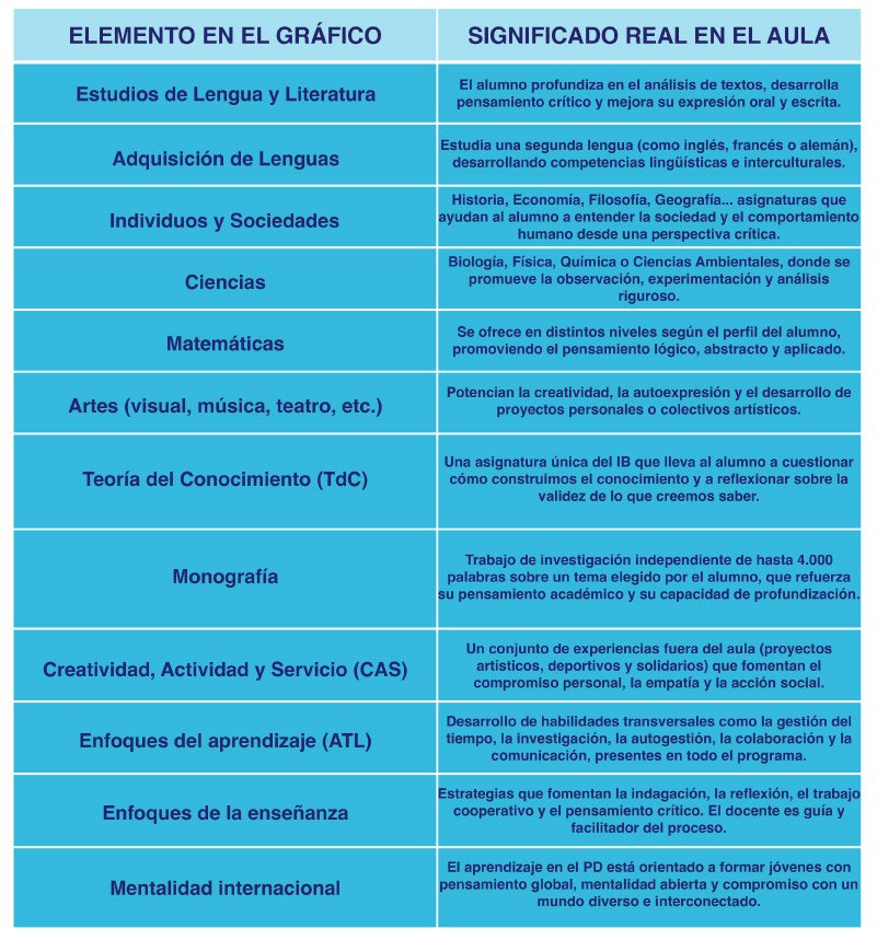 El currículo del Programa Diploma está diseñado para ofrecer a los alumnos una formación académica exigente, equilibrada y profundamente transformadora. A lo largo de dos años —normalmente cursados entre los 16 y los 18 años— los estudiantes construyen su conocimiento, consolidan su pensamiento crítico y desarrollan una conciencia ética y global, que los prepara para afrontar con éxito los retos universitarios, personales y profesionales que les esperan.
